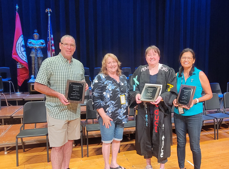 Retirees Todd Crandall, Wendy Bray and Bonnie Pelz stand with BOE President Martha Howard at the June 2023 retirement ceremony.